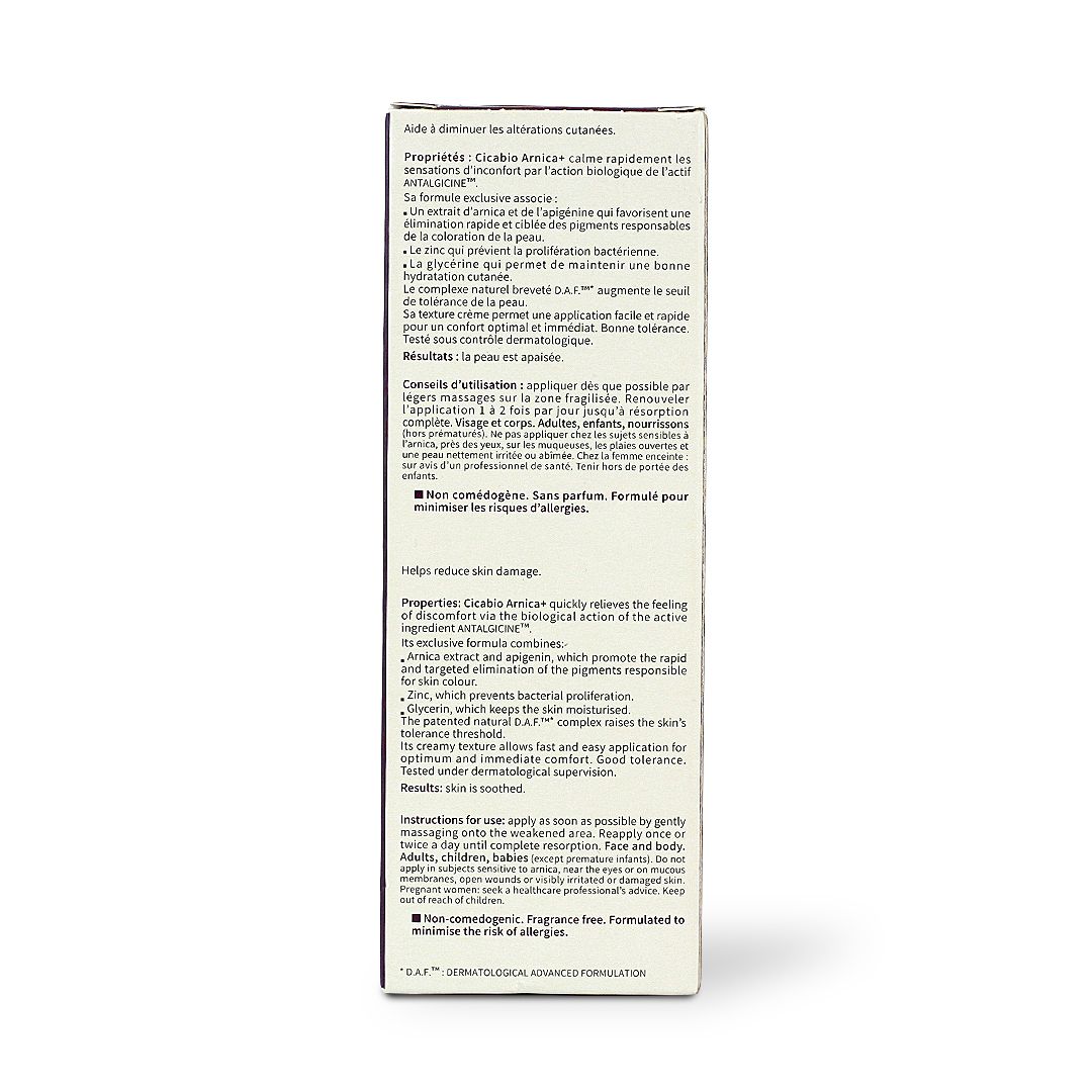 The care that quickly reduces feelings of discomfort, Cicabio Arnica+ is a soothing SOS cream. It quickly reduces skin damage and reduces feeling of discomfort. - For all the family except premature infants. - Non oily texture. - Ultra-fast absorption. - Unfragranced.