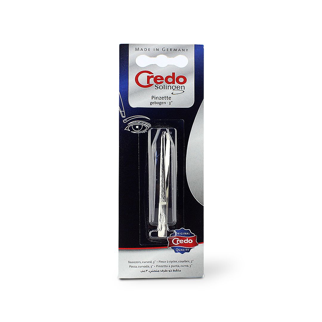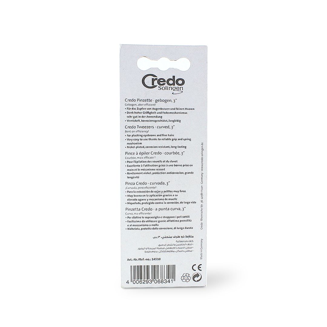 Curved tweezers from credo for plucking eyebrows and finest hairs. Easy to use with reliable grip and spring mechanism. Ideal for removing all types of hair. Nickel-plated, corrosion resistant, long lasting, Safe and easy to use.