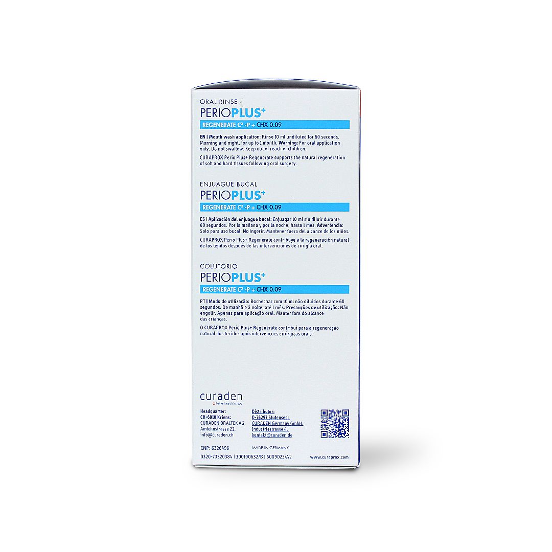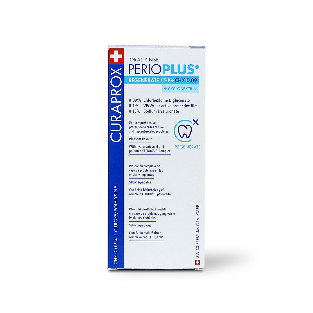Curaprox Perio Plus + Regenerate 0.09 CHX oral solution contains unique natural CITROX bioflavonoids derived from bitter oranges. Together with chlorhexidine, which has been known to dentists for centuries for its beneficial effects on teeth and gums, and hyaluronic acid, it is an effective blend suitable not only for the prevention of dental plaque and caries but also for the care of the oral cavity before and after surgery. - Does not alter the taste of food and drink. - Specially designed to protect after surgery or in cases of dry mouth, while acting as an additional prevention of bacterial infections. - Chlorhexidine concentration: 0.09%.