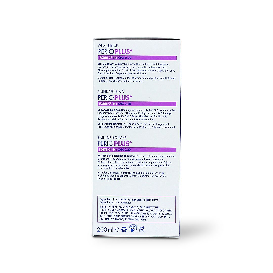 Perio Plus + Forte offers the most powerful antibacterial effect. Ideal for short-term use before, during and after invasive dental treatment. Curaprox Perio Plus Forte CHX 0.20% Mouthwash has Chlorhexidine (CHX) Di gluconate in addition to Citrox, the natural bioflavonoids extracted from bitter oranges (Citrus aurantium amara). Chlorhexidine Di gluconate 0.2% has proven chemical control of bacteria. Citrox/P formula is a natural extract of bitter oranges combined with polylysine amino acids to ensure long-lasting antibacterial effects by ensuring that it adheres well to the teeth, gums and oral mucosa. This formula also contains Xylitol for pleasant taste, to protect against caries and ensure strong teeth and PVP/VA for a highly effective protective film over the teeth, gums and oral mucosa.
