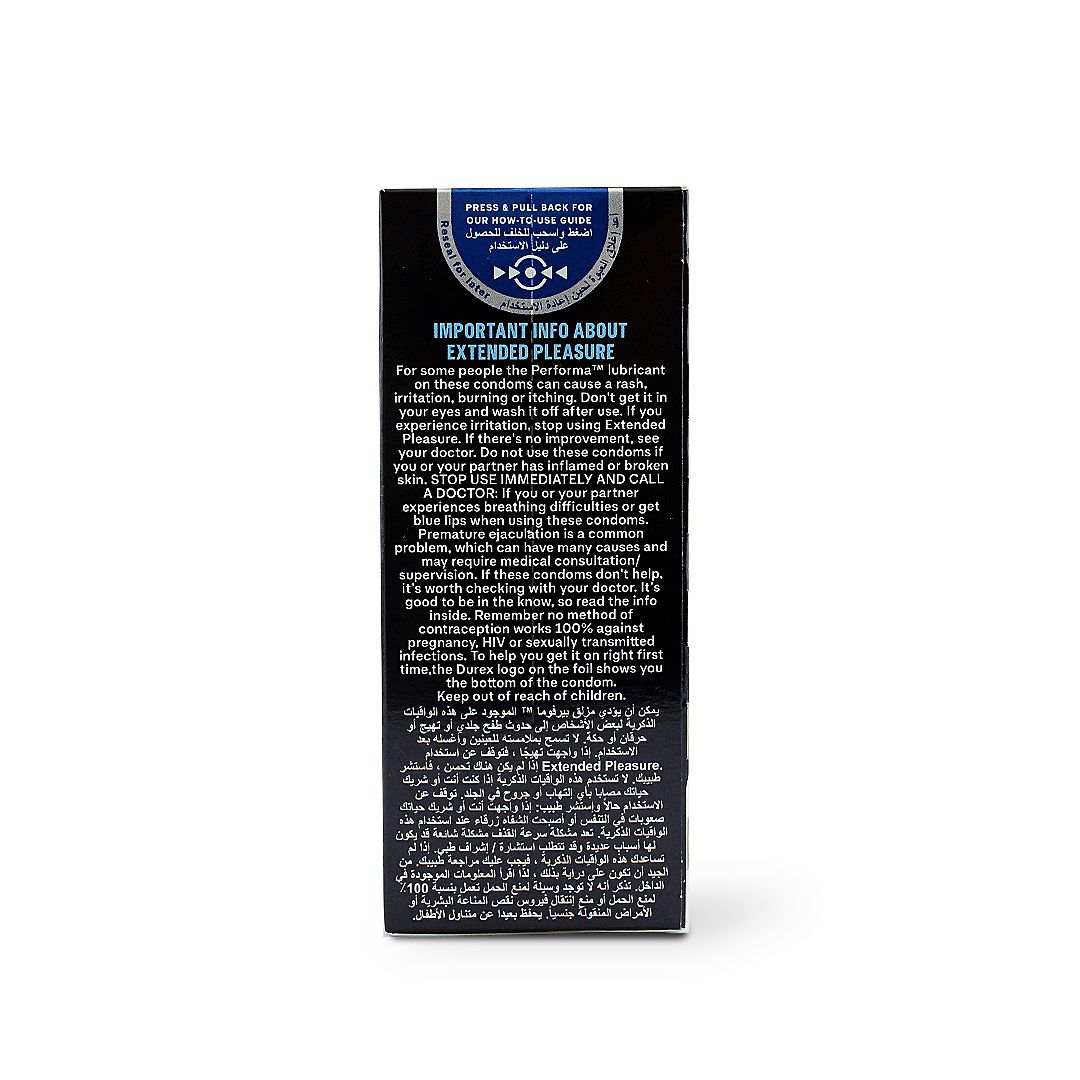 DUREX EXTENDED PLEASURE CONDOMS FOR LONGER LASTING PLEASURE - a condom made with Performa Silicone lubricant, with benzocaine 5%, a local anesthetic to help him last longer. EASE OF USE - this large girth with 56mm nominal width condom is designed with a teat ended, smooth shape. It's easy to put on, without interrupting the fun. DISCREET PACKAGING - nobody needs to know about your Durex condom delivery, but you. Packaging may vary. REDUCED LATEX SMELL - Durex Extended Pleasure is formulated for fun, with an odor masker for a less off putting latex scent. DUREX QUALITY - stands for durability, reliability, and excellence, Durex exceeds worldwide quality standards. 100% electronically, rigorously, and dermatologically tested, for true confidence and trust. Remember no method of contraception works 100% against pregnancy, HIV, or sexually transmitted infections. It's good to be in the know, so make sure you read the instructions and info inside.