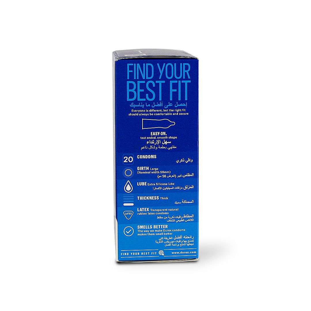 DUREX EXTRA SAFE CONDOMS FOR PEACE OF MIND AND PLEASURE - a slightly thicker latex condom with added lubrication, for extra comfort and sensuality, in all kinds of sexual experience. DISCREET PACKAGING - nobody needs to know about your Durex condom delivery, but you. Packaging may vary. REDUCED LATEX SMELL - Durex Extra Safe is formulated for fun, with a less off-putting latex scent. EASY TO USE - 56mm nominal width, designed with an easy-on, teat ended, smooth shape for ease of use, and to help you enjoy uninterrupted fun. DUREX QUALITY - stands for durability, reliability, and excellence, Durex exceeds worldwide quality standards. 100% electronically, rigorously, and dermatologically tested, for true confidence and trust. Durex Extra Safe transparent and lubricated condoms are made for a safe and sensual experience. Created with slightly thicker latex and extra lubrication, they're designed to enhance pleasure and protection in all kinds of sexual experiences. Relax and let go, knowing you can have fun without forfeit to safety. Remember, no contraceptive is 100% effective against pregnancy, HIV, or sexually transmitted infections. It's good to be in the know, so make sure you read the instructions inside info inside.