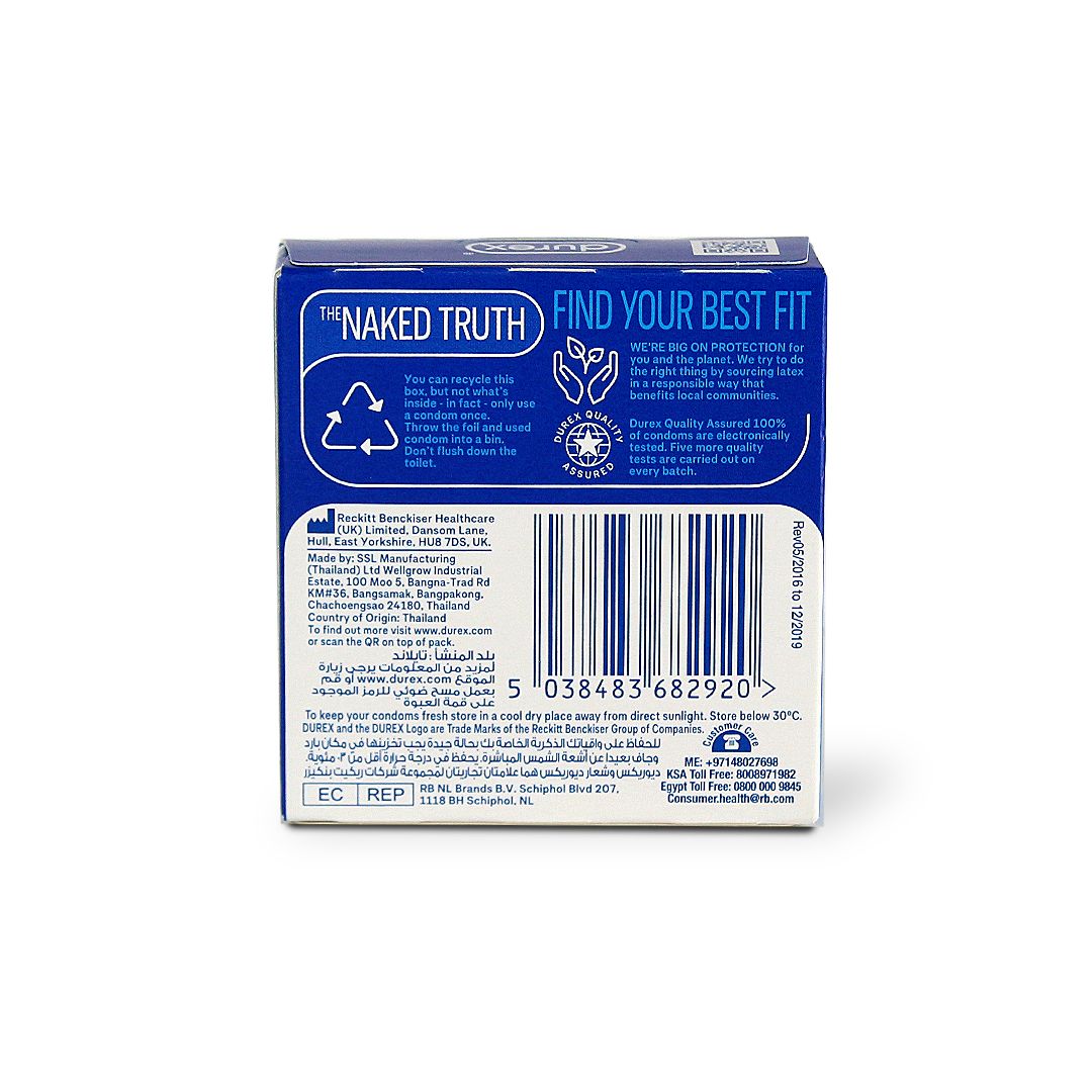 DUREX EXTRA SAFE CONDOMS FOR PEACE OF MIND AND PLEASURE - a slightly thicker latex condom with added lubrication, for extra comfort and sensuality, in all kinds of sexual experiences. DISCREET PACKAGING - nobody needs to know about your Durex condom delivery, but you. Packaging may vary. REDUCED LATEX SMELL - Durex Extra Safe is formulated for fun, with a less off-putting latex scent. EASY TO USE - 56mm nominal width, designed with an easy-on, teat ended, smooth shape for ease of use, and to help you enjoy uninterrupted fun. DUREX QUALITY - stands for durability, reliability, and excellence, Durex exceeds worldwide quality standards. 100% electronically, rigorously, and dermatologically tested, for true confidence and trust. Durex Extra Safe transparent and lubricated condoms are made for a safe and sensual experience. Created with slightly thicker latex and extra lubrication, they're designed to enhance pleasure and protection in all kinds of sexual experiences. Relax and let go, knowing you can have fun without forfeit to safety. Remember, no contraceptive is 100% effective against pregnancy, HIV, or sexually transmitted infections. It's good to be in the know, so make sure you read the instructions inside info inside.