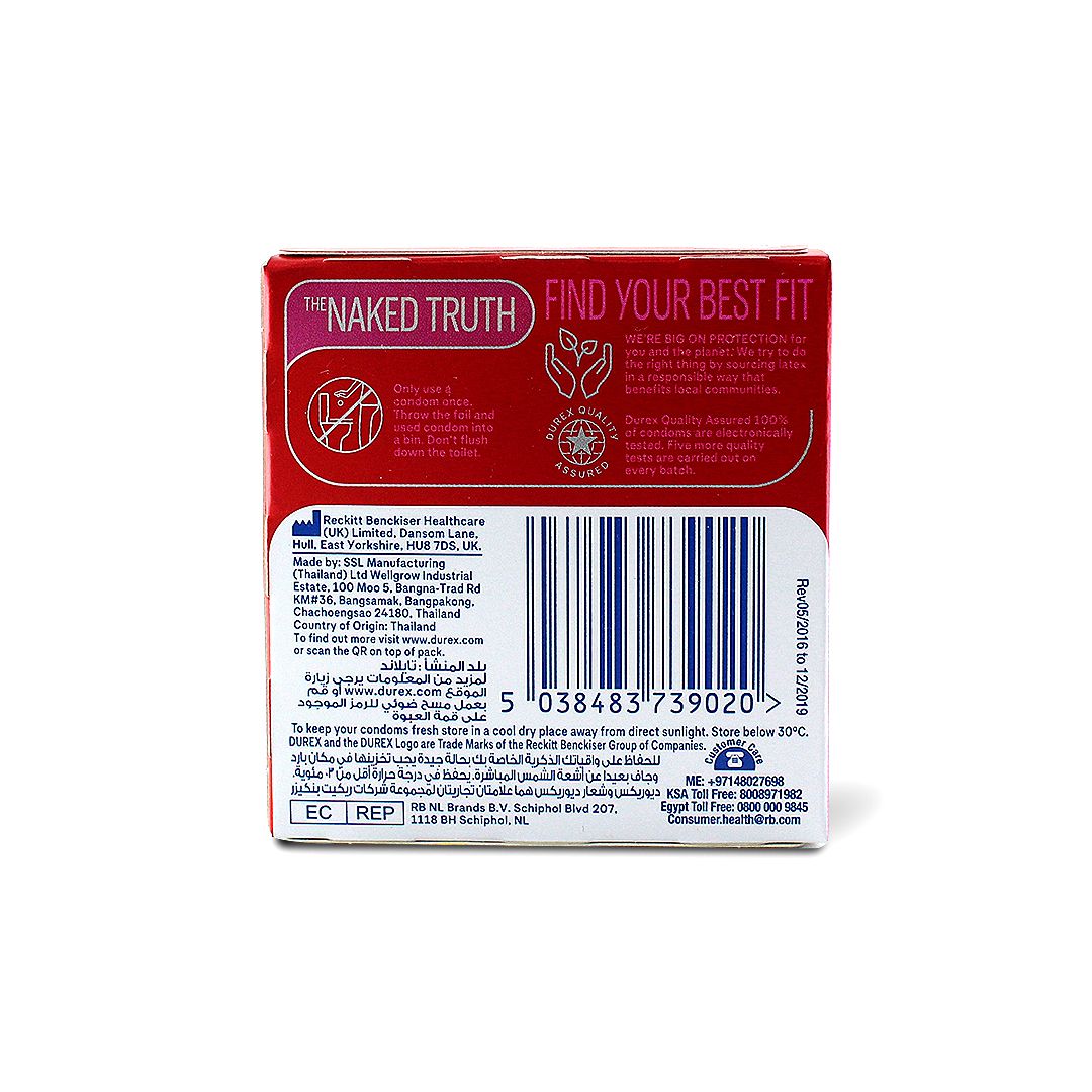 Durex thin feel condoms offer enhanced sensitivity, increasing the feeling of closeness to your partner without sacrificing safety. Help make the experience feel better by increasing sensitivity. Thin design condoms for enhanced feeling and sensitivity: increasing sensitivity between you and your partner, thin feel condoms can offer enhanced sensations due to their thin design, while maintaining the security and protection you'd expect from Durex. Your favorite condoms in updated packaging: redesigned, fresh new packaging, however, don't worry, your favorite condoms inside the box are still exactly the same. 12 large lubricated, easy-on condoms: large size (girth nominal width: 56mm, length: 195mm) transparent natural latex condoms shaped to be easier to put on and provide a sleek fit and feel during the experience. Pre-lubed with silicone lube. Discreet delivery: condom box always delivered in discreet packaging with no indication of contents inside. Durex quality, from the world's no 1 condom brand: with over 90 years of expertise manufacturing condoms, all Durex condoms are made from the finest quality raw materials and 100% electronically tested for holes and imperfections with 5 more quality tests carried out on every batch; dermatologically tested too. Remember no method of contraception works 100% against pregnancy, HIV, or sexually transmitted infections. It's good to be in the know, so read the info inside.