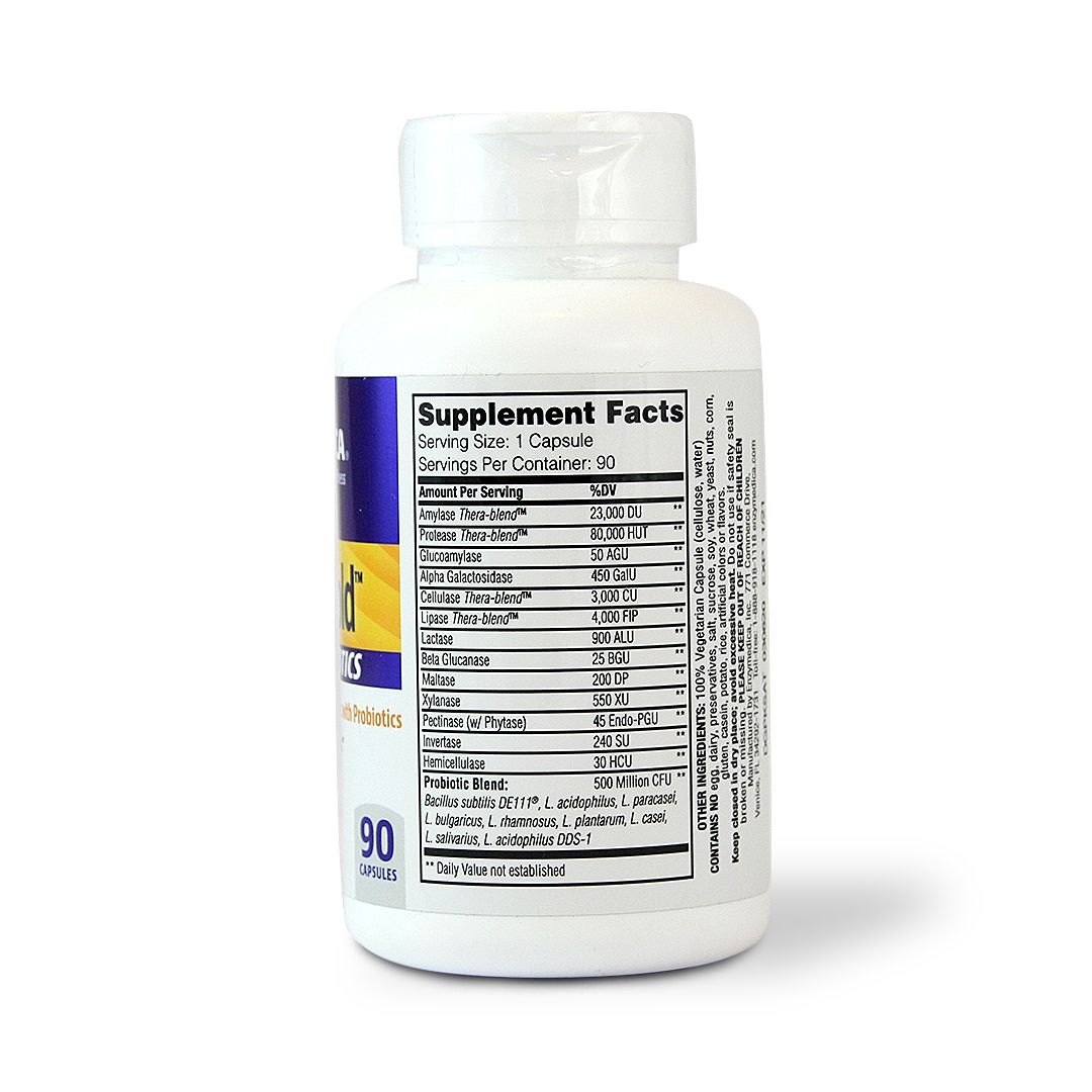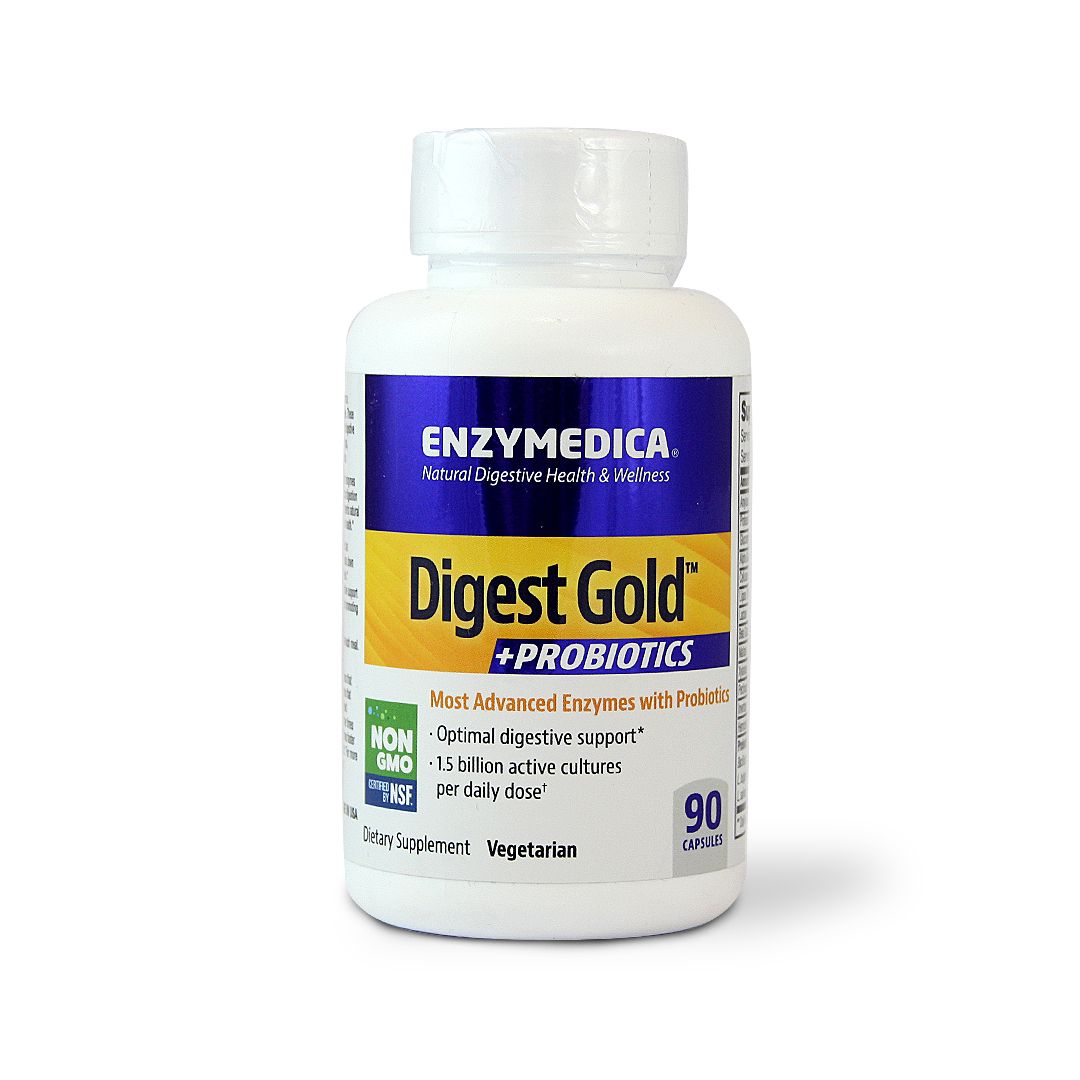 Enzyme deficiencies may result from a combination of age, diet, and lifestyle. These deficiencies can lead to a variety of digestive discomforts, including occasional gas, bloating, irregularity, and indigestion. Fortifying the digestive system with enzymes and probiotics may promote optimal digestion while maintaining the digestive system's natural balance to support overall digestive health. Digest Gold + Probiotics contains an advanced enzyme formula that breaks down carbohydrates, fats, fiber, and protein. Probiotics provide additional digestive support by boosting enzyme production and promoting regularity. * Most Advanced Enzyme with Probiotics. * Optimal digestive support. * Certified Non GMO, Vegetarian, and Gluten Free * Free from Egg, Dairy, Preservatives, Salt, Sucrose, Soy, Wheat, Nuts, Corn, Casein, Potato, Rice, Artificial colours, or Flavours. Ingredients: Amylase Thera-Blend, Protease Thera-Blend, Glucoamylase, Alpha Galactosidase, Cellulase Thera-Blend, Lipase Thera-Blend, Lactase, Beta Glucanase, Maltase, Xylanase, Pectinase, Invertase, Hemicellulase, Probiotic Blend, Cellulose, Water.