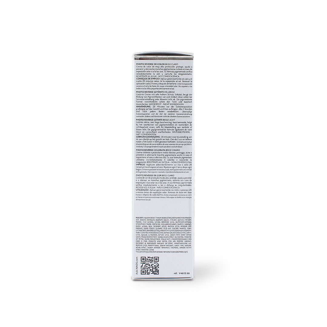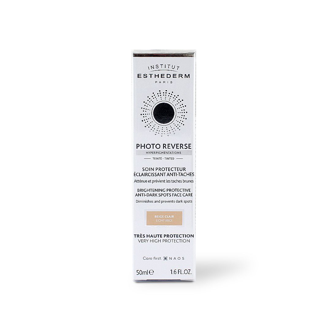 Esthederm Photo Reverse Tinted Light Beige is a photo reverse depigmenting sunscreen with color that protects the skin from UVB/UVA radiation and blue light, allowing to clear hyperpigmented areas. Inhibition of melanin production, dark spots reduction, and more brightness to your complexion!