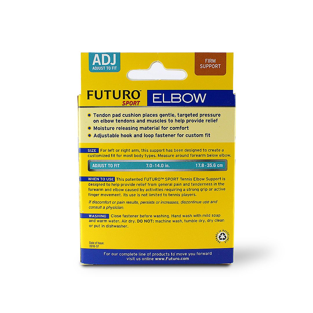 The FUTURO Sport Tennis Elbow Support is designed to keep you in winning form. You and your backhand do not have to hold back anymore, and you don't have to be a tennis player to enjoy a strong grip or active finger movements. The support helps provide a firm, stabilizing protection and compression. A Patented Tendon Pad cushion places gentle, targeted pressure on elbow tendons and muscles to help provide the support you need to get back on the court. - Adjustable strap provides a customizable fit. - Tendon pad applies zoned pressure to help provide support to elbows affected by the symptoms of tendonitis. - Breathable materials help keep you cool.