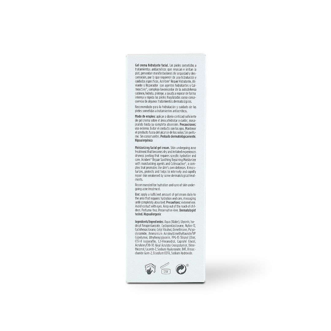 Deep, long-lasting moisturising thanks to its specific formula with calmoactive, glycerine and hyaluronic acid. Acniben Repair Moisturizer, Soothing and Repairing Gel cream. After gently cleansing, you need to soothe and repair fragile skin undergoing acne treatments. Helps reduce dryness, irritation and flaking. Absorbs quickly, with no oily residue. No perfumes or preservatives. Ingredients: Calmoactive.