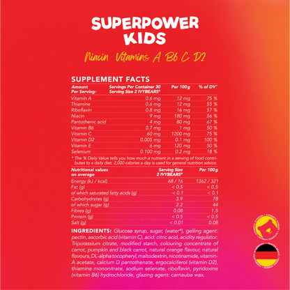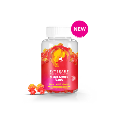 Boost your child's wellbeing with IVYBEARS® Superpower Kids Gummies. Formulated with essential nutrients like Vitamin C, D2, B6, and A, these delicious, berry-flavored gummies are vegan, gluten-free, soy-free, and made without artificial colors, sweeteners, or preservatives. Made in Germany for the highest quality and safety. Give your little ones the superpowers they need to thrive!