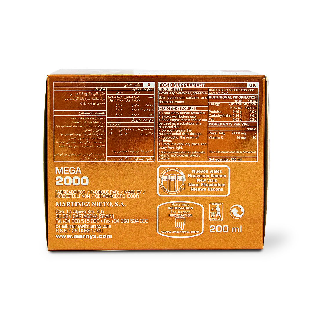 MARNYS MEGA 2000 mg is a sugar free food supplement suitable for diabetics. It contains royal jelly and vitamin C, and their synergic effect supports the body immune defenses against microbes thus reducing the severity & duration of the cold & flu symptoms while supplying the body with energy. MARNYS Mega 2000 Natural source of minerals, vitamins, amino acids, and acetylcholine in drinkable vials.