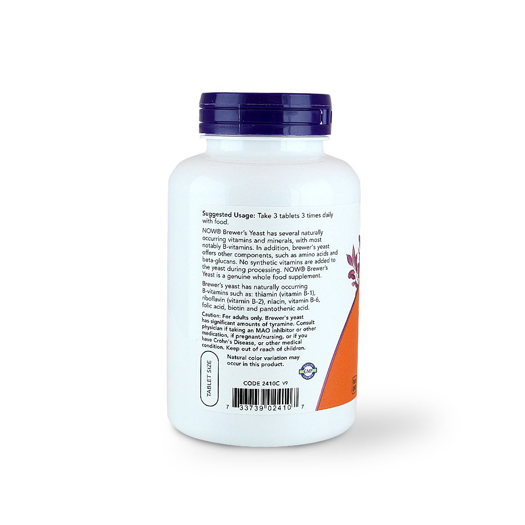 NOW BREWERS YEAST 10 GRAIN TABS. 200 is a natural source of vitamin B, and minerals and is considered a whole food supplement. Brewer's Yeast has several naturally occurring vitamins, minerals, and other beneficial nutrients. Brewer's yeast offers other components such as amino acids and beta-glucans. No synthetic vitamins are added to the yeast during processing. Brewer's Yeast has naturally occurring B vitamins such as Thiamin (Vitamin B-1), Riboflavin (Vitamin B-2), Niacin, Vitamin B-6, Folic Acid, Vitamin B-12, Biotin, and Pantothenic Acid. Natural color variations may occur in this product. Store in a cool, dry place after opening. * 10 Grains, 650 mg. * Easier to Swallow Tablets. * Non-GMO. * Kosher certified. * Free from Wheat, Gluten, Dairy, Egg, Fish, Shellfish, Soy, Corn, and Tree nut. * Suitable for vegans and vegetarians. Ingredients: Brewer'S Yeast (Dried, Inactive) 1.95 G (1,950 Mg), Hydroxypropyl Cellulose, Stearic Acid (Vegetable Source), Croscarmellose Sodium, Magnesium Stearate (Vegetable Source), And Silicon Dioxide.