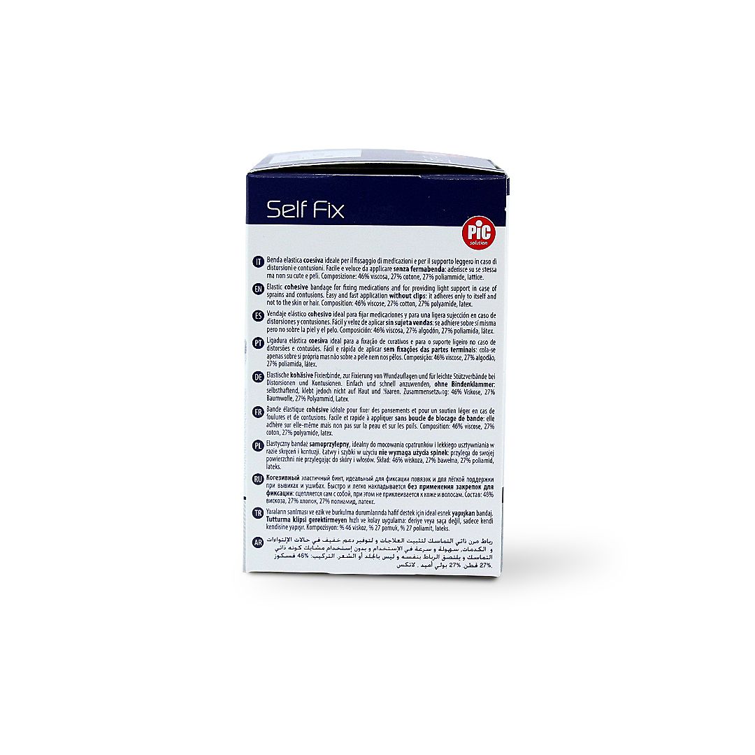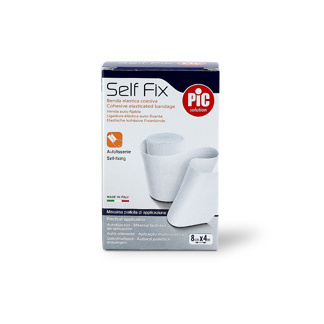 Elastic cohesive bandage for fixing medications and for providing light support in case of sprains and contusions. Easy and fast application without clips, it adheres only to itself and not to the skin or hair.